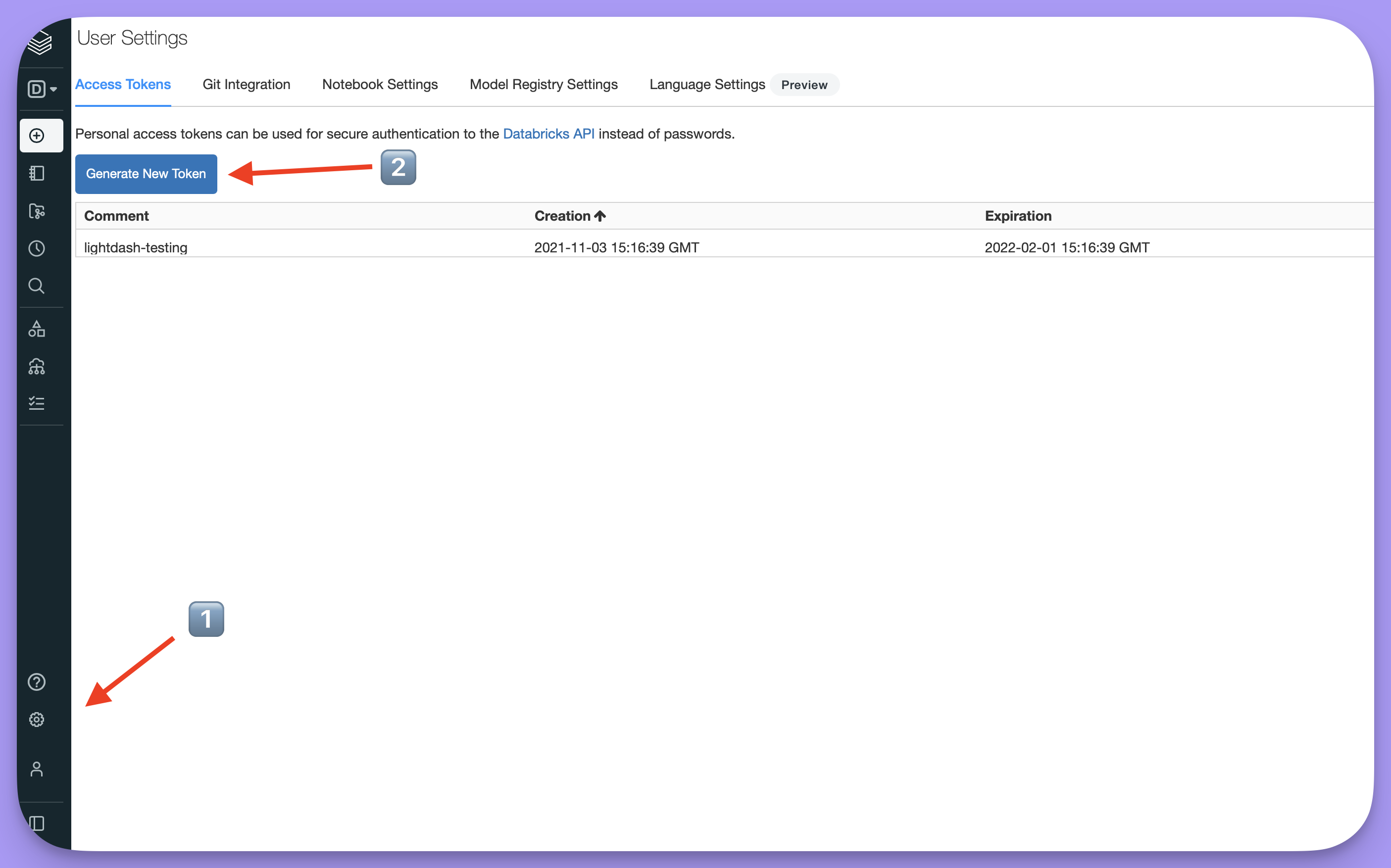 Generate token. You’ll be asked to enter a name and expiry. - Copy the token