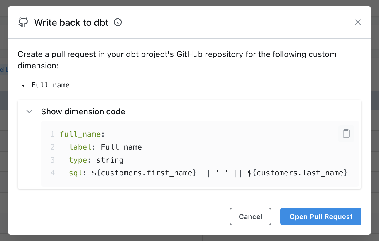 Open pull request will open a pull request created by Lightdash against your dbt project in GitHub or GitLab.