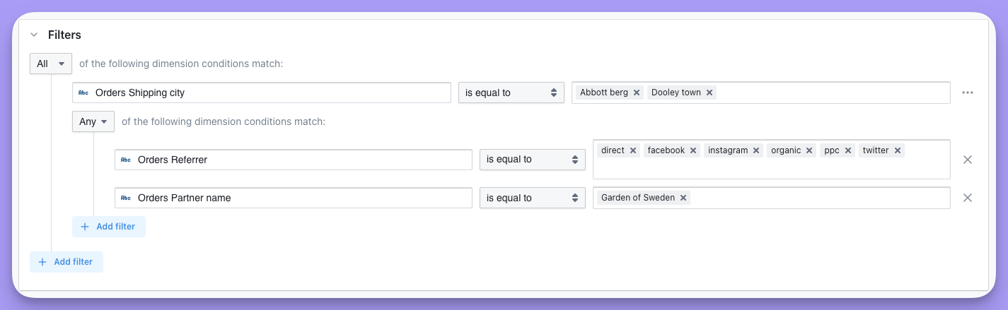 Here are some general tips about filters that apply to using them in both the Explore view and in dashboards.If you want to have multiple filters, just click + Add filter